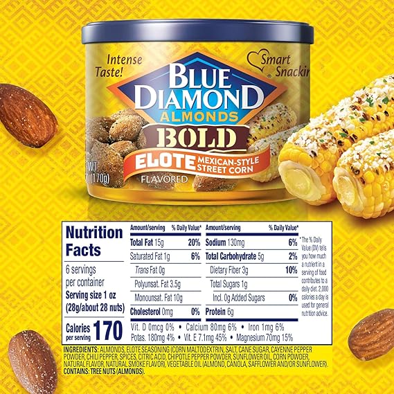 Blue Diamond Almonds, BOLD Elote Mexican Street Corn Flavored Snack Nuts, 6 Ounce Can