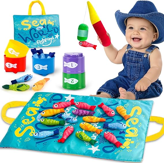 - Montessori Fishing Toy Set – Includes a fishing pole, 15pcs cloth fish, 5pcs stackable fish buckets, and an ocean-themed play mat that doubles as a storage bag, making it easy to storage and carry on the go for travel or outdoor play—perfect montessori toys for 1-year-old kids to enjoy fishing fun at the beach, backyard, or park.
